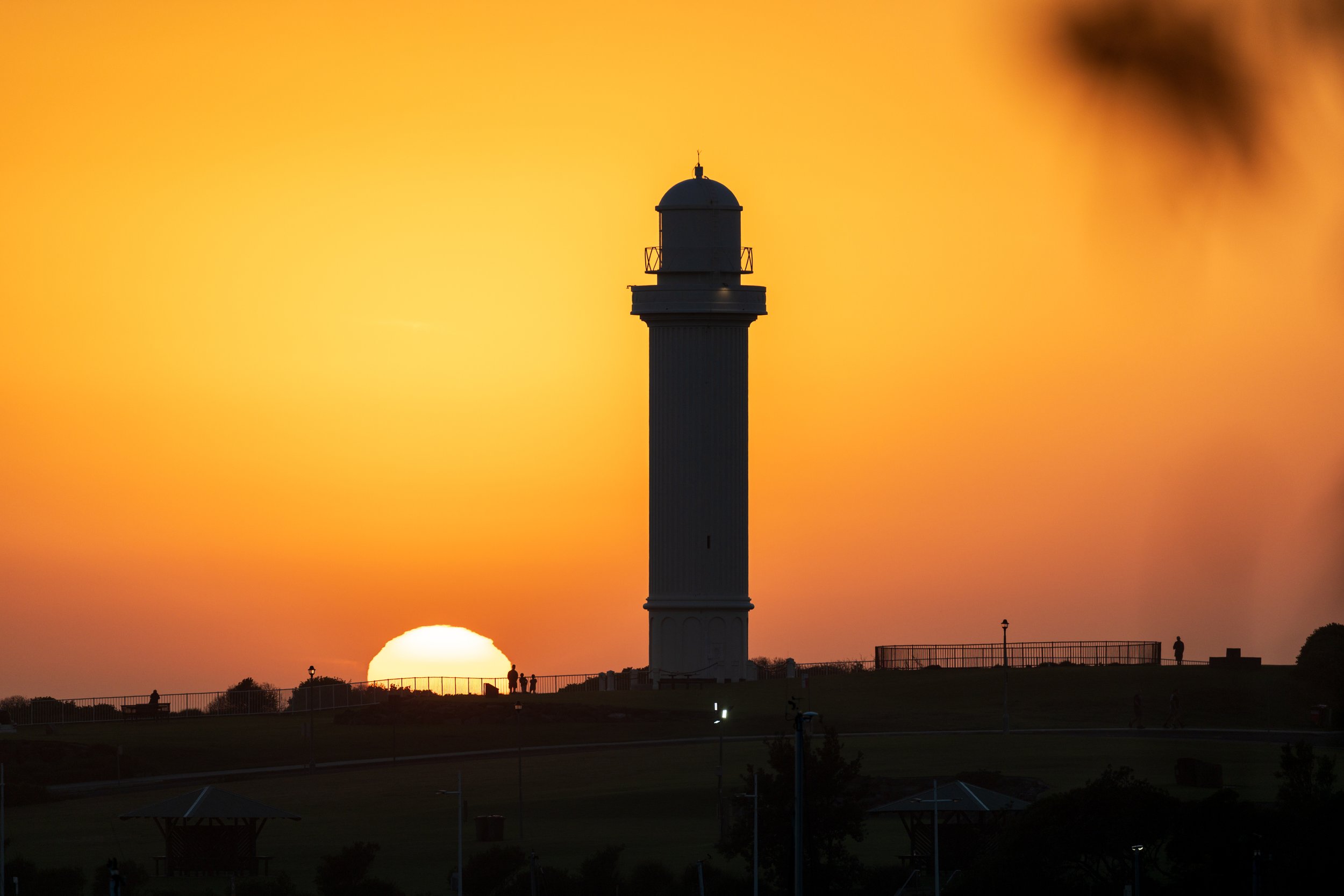 Coming down the stairs towards the bike track/walkway the sun started rising, from my angle it was just to the left of the main lighthouse over at Flagstaff Hill. I quickly got down the stairs and put my long lens on and managed to capture what looks like a parent and their two kids watching the sun rise next to the lighthouse.
